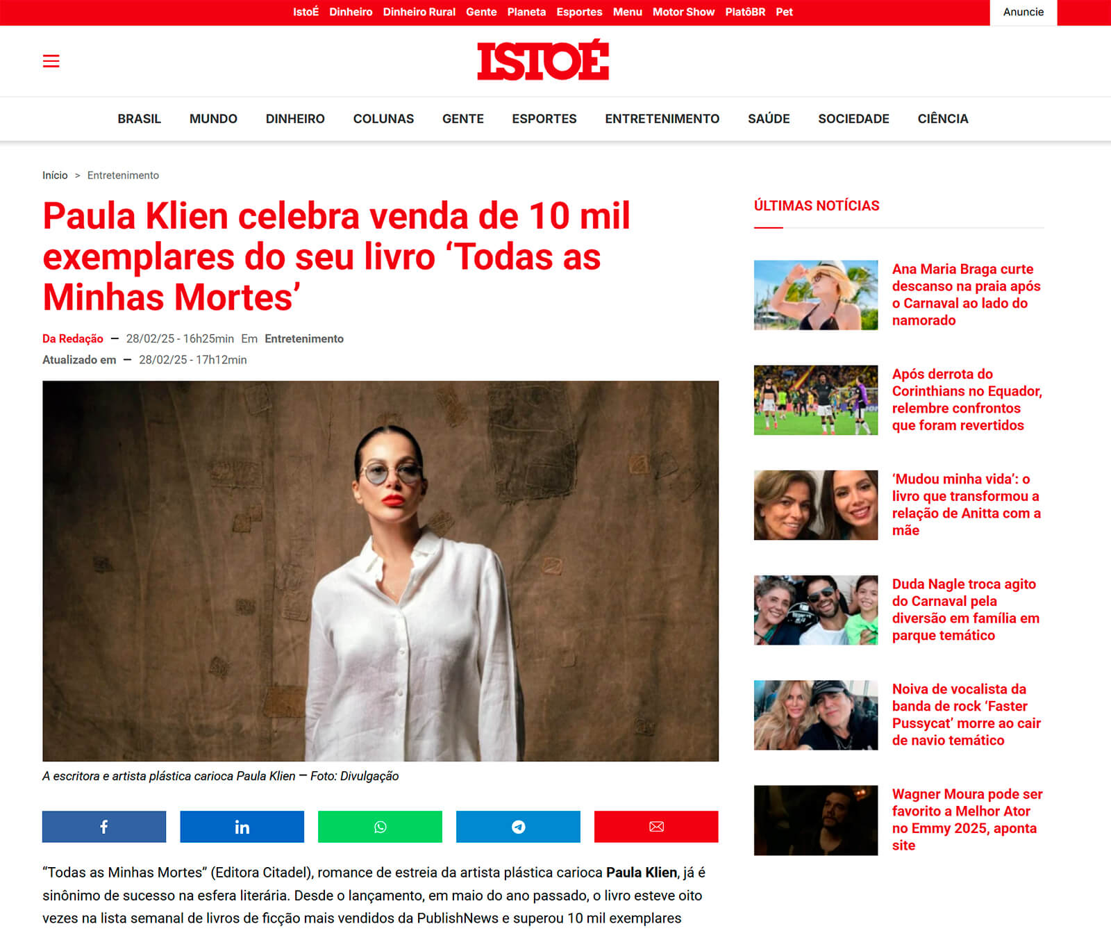 Matéria no site da Isto É sobre o livro Todas as Minhas Mortes, de Paula Klien.