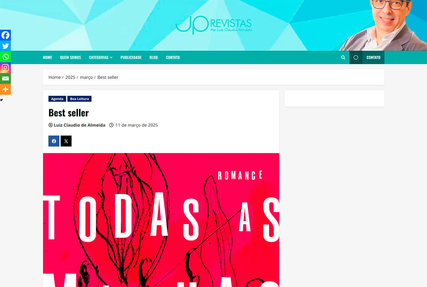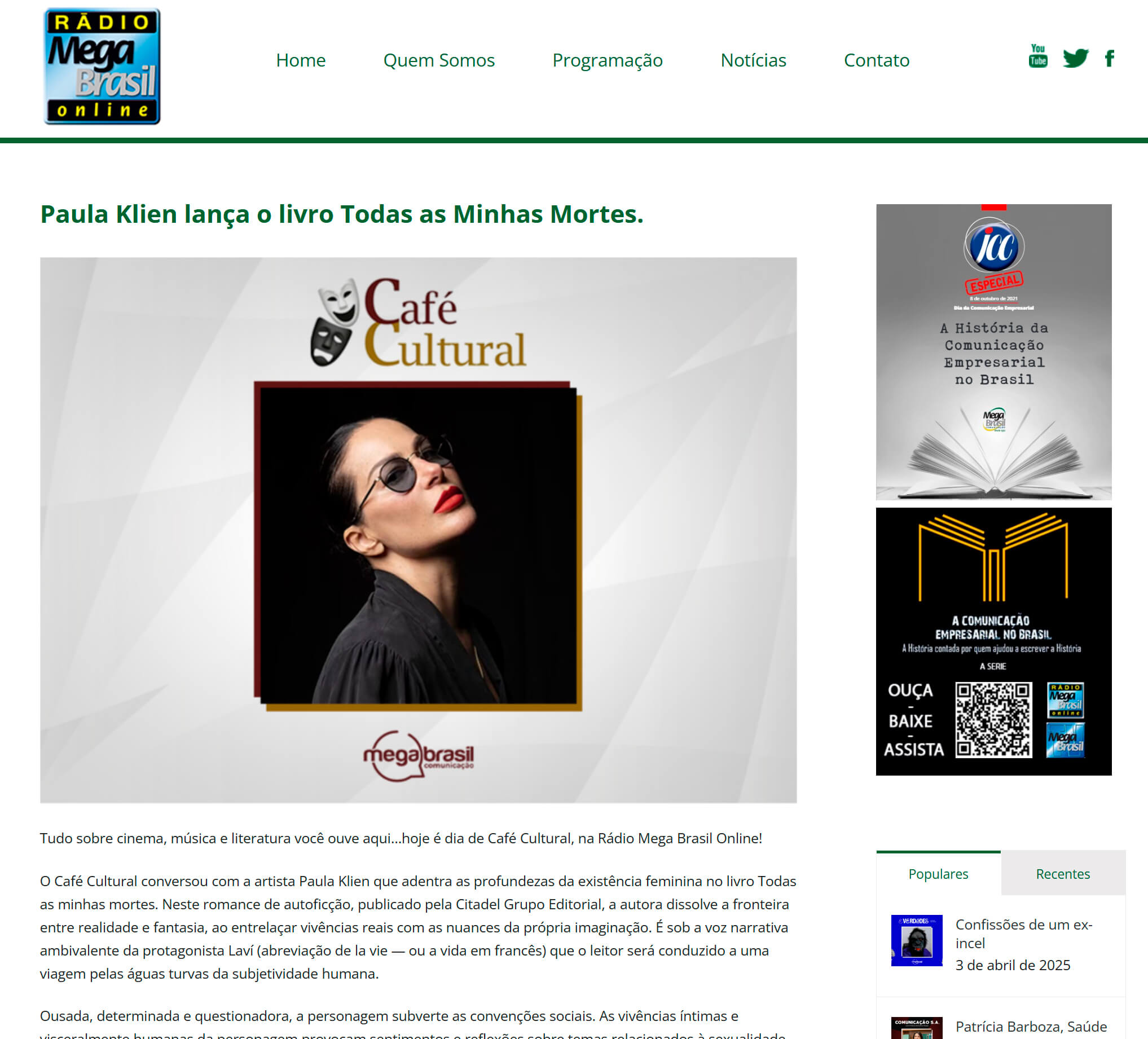 Matéria no site Rádio Mega Brasil Online sobre o livro Todas as Minhas Mortes, de Paula Klien.