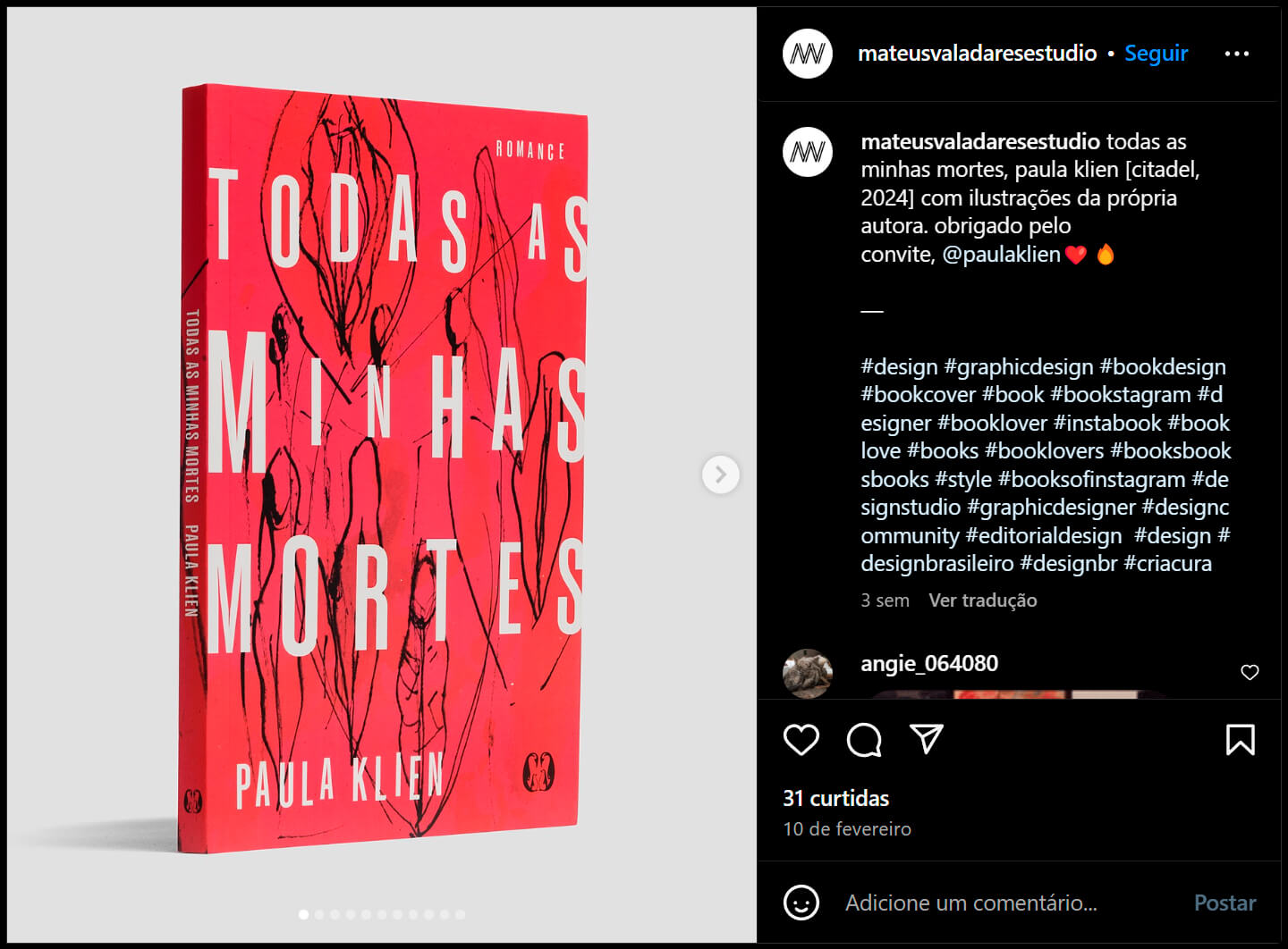 Postagem no Instagram do Mateus Valadares Estúdio sobre o livro Todas as Minhas Mortes, de Paula Klien.