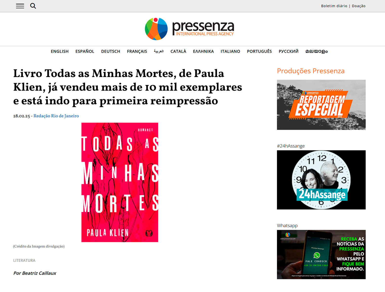 Matéria no site Pressenza sobre o livro Todas as Minhas Mortes, de Paula Klien.