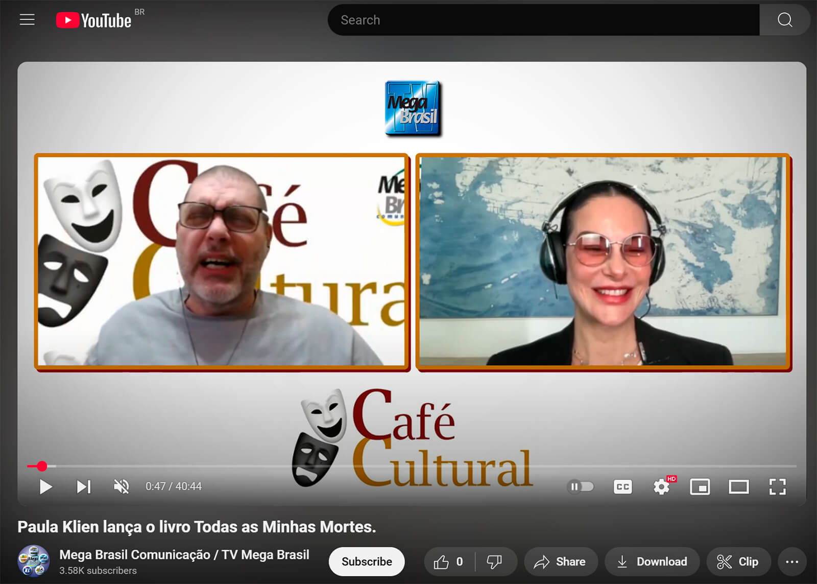 Matéria no canal de Youtube Mega Brasil Comunicação, da TV Mega Brasil, sobre o livro Todas as Minhas Mortes, de Paula Klien.